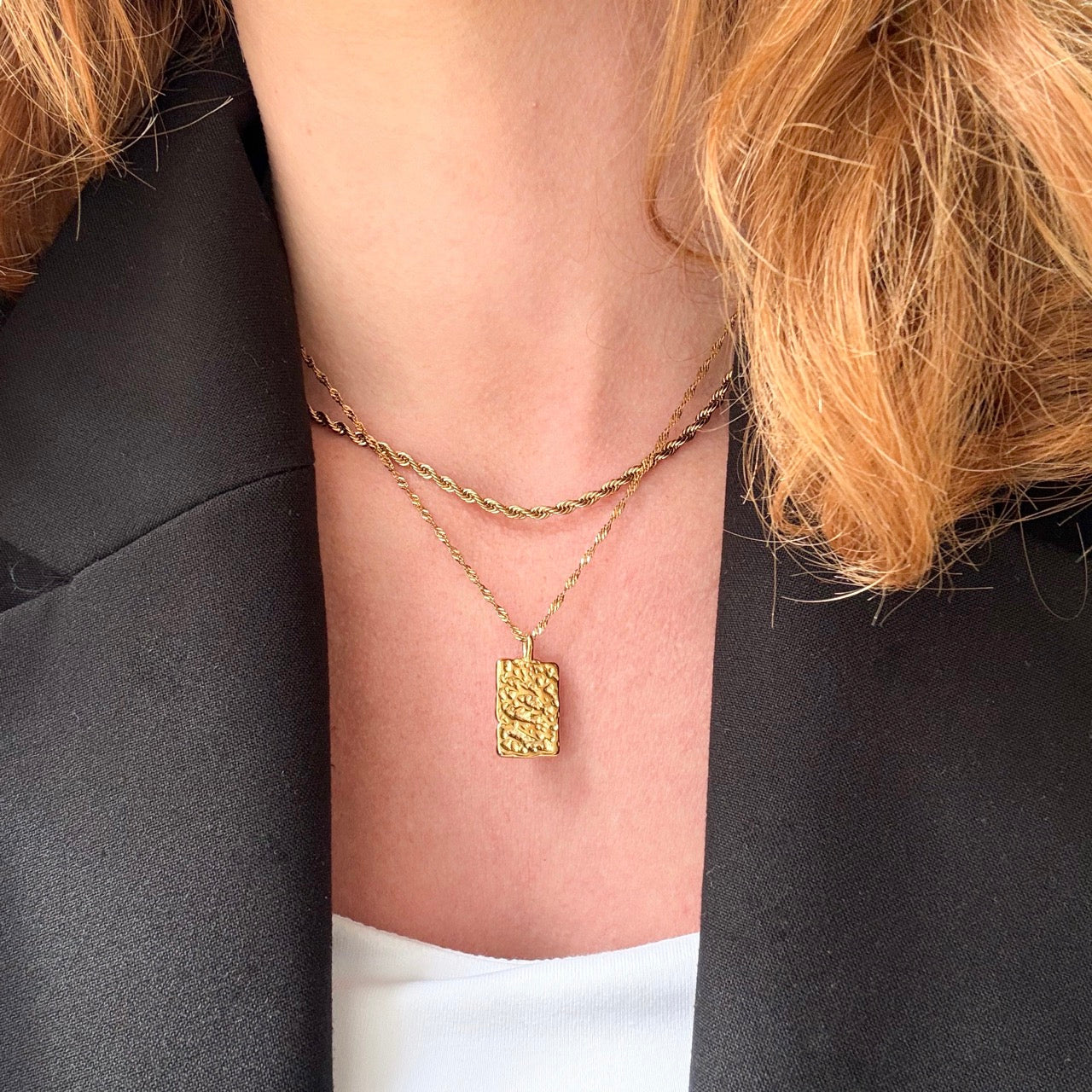Matériaux : Acier inoxydable plaqué or 18 carats avec revêtement PVD. Le collier est résistant à l’eau, hypoallergénique, sans plomb et sans nickel.